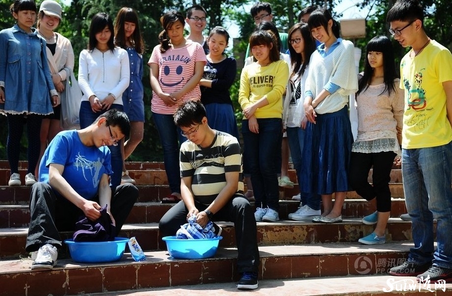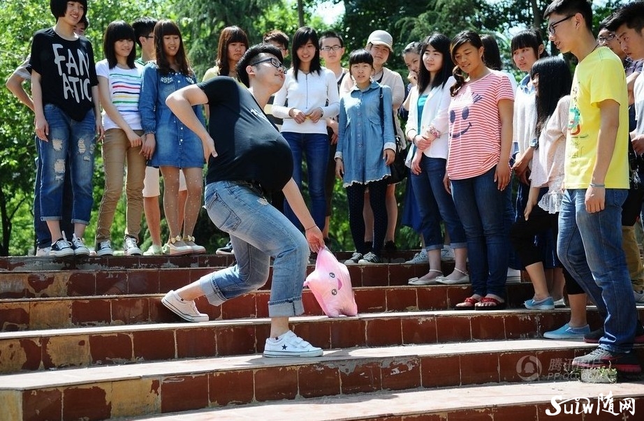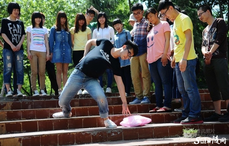 5月12日,山東聊城大學(xué)學(xué)生扮成“孕婦”模樣撿東西,體驗?zāi)赣H十月懷胎的艱辛。新華社發(fā)(張振祥 攝)