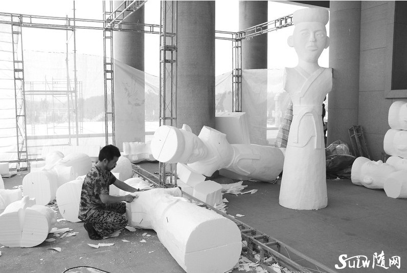 世界華人炎帝故里尋根節(jié)拜祖大典籌備工作正在緊鑼密鼓進行中,圖為工作人員在制作舞臺道具人俑。