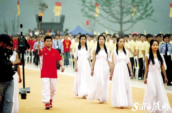 圖為 奧運冠軍鄭李輝(左)在白衣少女的護衛(wèi)下傳遞圣火。