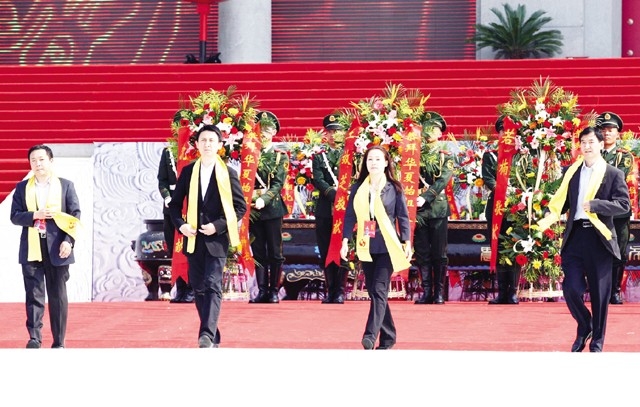 ◆國務(wù)院臺灣事務(wù)辦公室主任助理龍明彪(中)、國務(wù)院僑務(wù)辦公室黨組成員熊昌良(左)、中華炎黃文化研究會常務(wù)副會長屈忠(右)敬獻(xiàn)花籃。