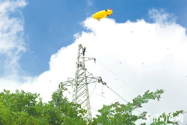 6月18日,大洪山風(fēng)景名勝區(qū)白龍池變電站電力施工中首次采用飛艇牽引的方式高架線路。由于施工現(xiàn)場山高林密,30座高架鐵塔從海拔200米一直延伸到海拔1000米左右高度,施工難度極大。