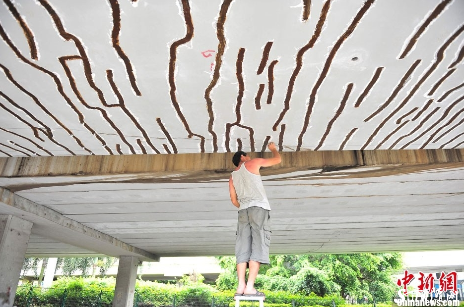 8月7日,?谑心洗髽驀(guó)興大道引橋橋體出現(xiàn)密密麻麻的裂縫,現(xiàn)場(chǎng)工人正在對(duì)橋體裂縫進(jìn)行修補(bǔ)。駱云飛 攝