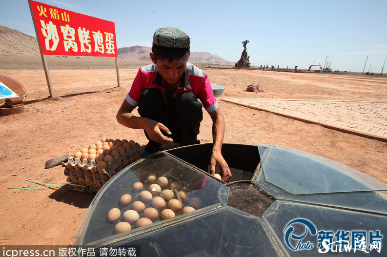 2013年8月11日,新疆吐魯番市氣溫竄上42度,火焰山下地表溫度達(dá)到70度,景區(qū)經(jīng)營(yíng)者利用戈壁地表高溫烤熟的雞蛋,成為旅游者喜愛(ài)的特色食品。雖然每枚烤雞蛋5元錢(qián)一個(gè),眾多游客還是樂(lè)意花錢(qián)一嘗新鮮。圖片來(lái)源:東方IC