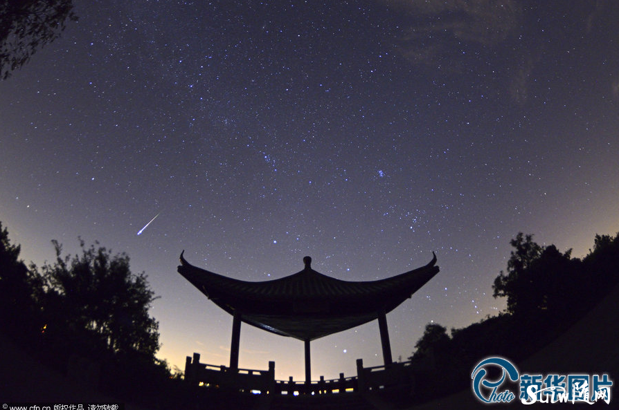 2013年08月13日,浙江省嘉興市,凌晨3點多,一顆流星劃過海鹽縣南北湖景區(qū)望湖亭上空。 徐志達/CFP