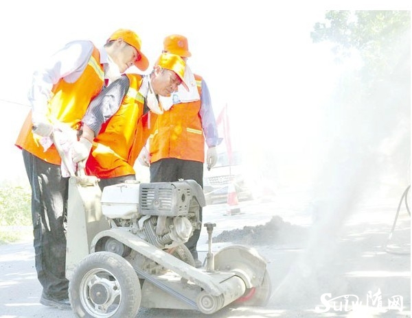 全市公路系統(tǒng)養(yǎng)護(hù)工技術(shù)比武日前在曾都區(qū)舉行。圖為選手正在進(jìn)行油路病害坑槽開挖與修補(bǔ)作業(yè)。