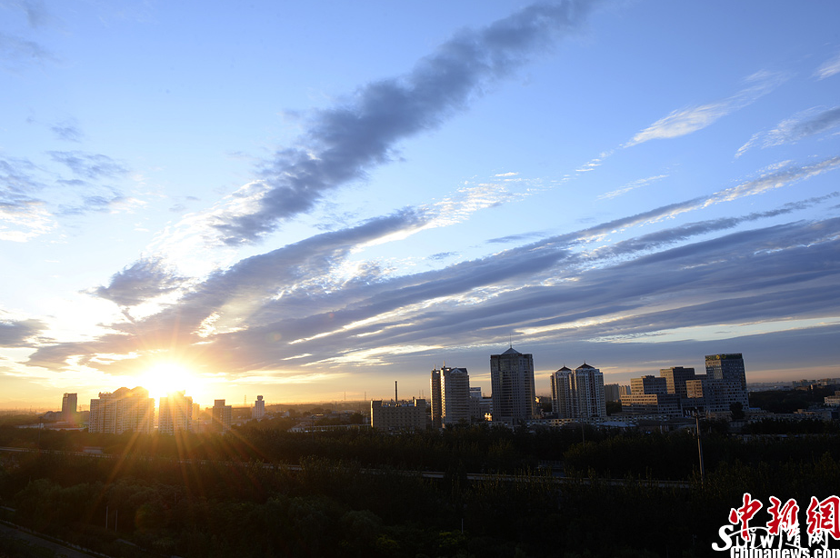 8月18日清晨,北京碧空如洗,天空被迷人的朝霞籠罩,美不勝收。中新社發(fā) 侯宇 攝