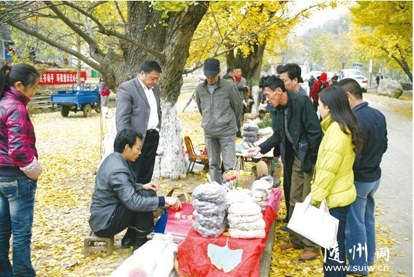 金秋旅游帶動了曾都區(qū)洛陽鎮(zhèn)土特產(chǎn)品的銷售,原汁原味的銀杏等農(nóng)特產(chǎn)品成為外地游客的搶手貨。 (記者 孫洪濤攝)
