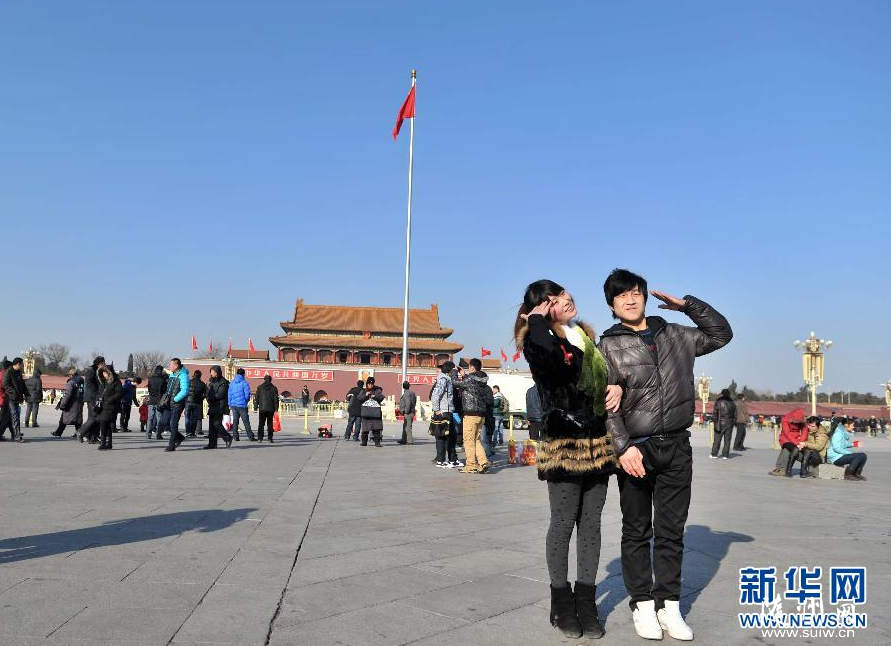 2013年1月16日,霧霾過(guò)后,兩名游客在北京天安門(mén)廣場(chǎng)拍照留念。 近三年,北京遭遇過(guò)數(shù)次較嚴(yán)重的霧霾天氣,清風(fēng)送走霧霾,數(shù)次離別,愿再不相見(jiàn)。 新華社記者 李文 攝