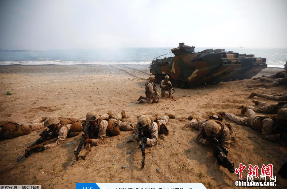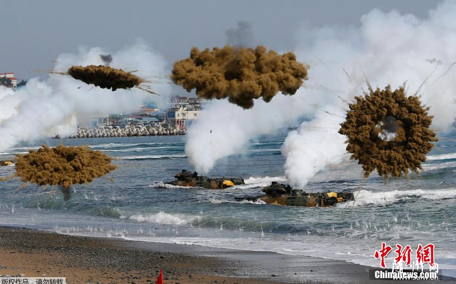 當(dāng)?shù)貢r間2014年3月31日,韓國浦項,韓美聯(lián)合登陸演習(xí)(CJLOTS)進(jìn)行,該演習(xí)是韓美年度軍事演習(xí)“雛鷹”的一部分。據(jù)韓聯(lián)社3月27日報道,韓美海軍和海軍陸戰(zhàn)隊27日開始舉行名為“雙龍”的聯(lián)合登陸作戰(zhàn)演習(xí),演習(xí)將持續(xù)到4月7日。今年的參演兵力是1993年“團隊精神”軍演后的最大規(guī)模。