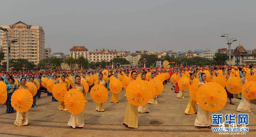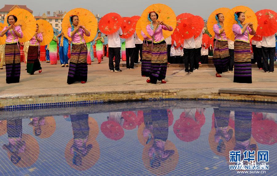 4月14日,上萬名群眾齊跳傣族傘舞。當(dāng)日,隨著鏗鏘有力的铓鑼聲、鼓點(diǎn)聲,云南省西雙版納傣族自治州10580名群眾身著節(jié)日盛裝,在景洪市潑水廣場上舞動(dòng)花傘,翩翩起舞。傘舞是傣族傳統(tǒng)舞蹈之一,每當(dāng)傣族潑水節(jié)、上新房等喜慶日子來臨時(shí),傣家人都要跳起傘舞,場面壯觀。新華社記者 藺以光 攝