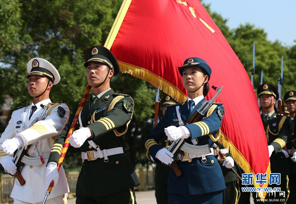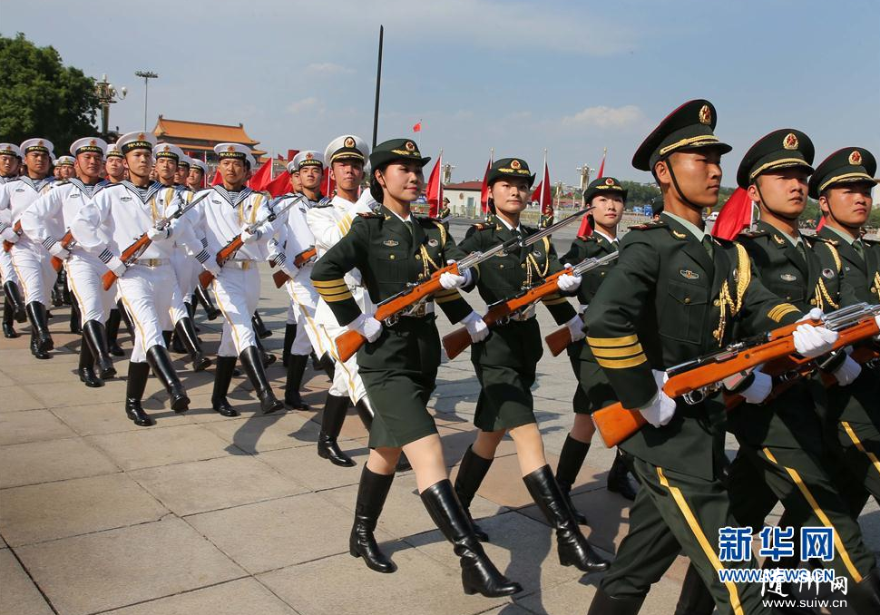 新華網(wǎng)北京5月12日電(記者劉濟(jì)美)巾幗女兵,颯爽英姿。12日下午,在人民大會堂東門外廣場舉行的歡迎土庫曼斯坦總統(tǒng)庫爾班古力·別爾德穆哈梅多夫來訪的儀式上,我軍首批三軍儀仗隊女兵精彩亮相,接受兩國領(lǐng)導(dǎo)人檢閱! ∩碇07式禮賓服的13名儀仗隊女兵分列在軍旗組和陸軍、海軍和空軍軍種之中,與男儀仗兵一起伴隨檢閱曲,手持禮賓槍接受檢閱! ∪妰x仗隊大隊長李本濤介紹說:“這是三軍儀仗隊建隊62年來首次招收女兵,首次執(zhí)行外交司禮任務(wù),有利于全面彰顯國威與軍威! 新華社記者龐興雷 攝