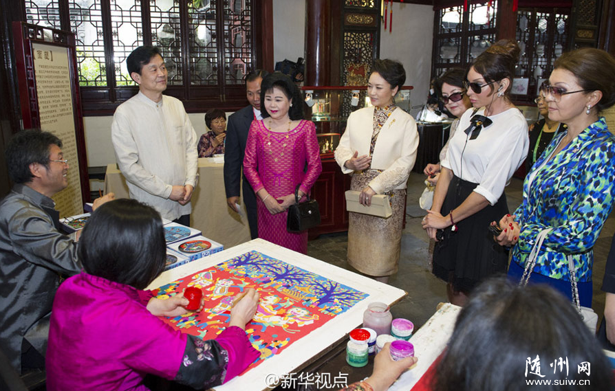 新華網(wǎng)北京5月21日電 據(jù)新華社“新華視點(diǎn)”微博報(bào)道,彭麗媛21日邀請出席亞信峰會(huì)國家領(lǐng)導(dǎo)人夫人觀看非物質(zhì)文化遺產(chǎn)展示和文藝演出。 彭麗媛和貴賓們到上海豫園,參觀金山農(nóng)民畫、面塑、顧繡、木版水印、扎染等展示,欣賞少兒歌舞《茉莉花》、昆曲《牡丹亭》選段、滬劇與二胡《燕燕做媒》、太極·古琴《高山流水》、京劇選段《梨花頌》等演出。 彭麗媛和貴賓們在豫園靜觀的展臺前駐足停留,聽取介紹。彭麗媛不時(shí)拿起面塑、扎染布等傳統(tǒng)手工藝品給貴賓們欣賞!稗r(nóng)民畫用的是什么顏料?”“木版水印和版畫有什么區(qū)別?”“扎染布會(huì)褪色嗎?”……大家紛紛提問,同非物質(zhì)文化遺產(chǎn)傳承人親切交流。