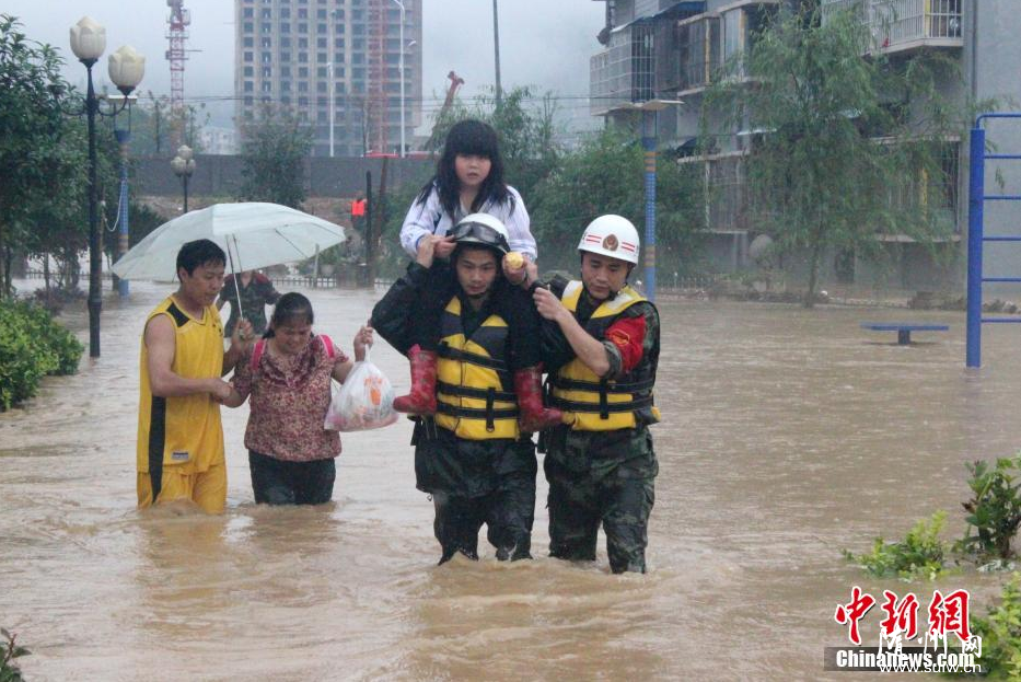 5月25日,貴州省銅仁市江口縣因強(qiáng)降雨,致道路溢水中斷,商鋪、民房被淹受損。近日,貴州多地持續(xù)強(qiáng)降雨,全省共57縣1013鄉(xiāng)鎮(zhèn)出現(xiàn)降雨,26個(gè)鄉(xiāng)鎮(zhèn)出現(xiàn)暴雨。圖為消防員疏散被困民眾。中新社發(fā) 田維虎 攝