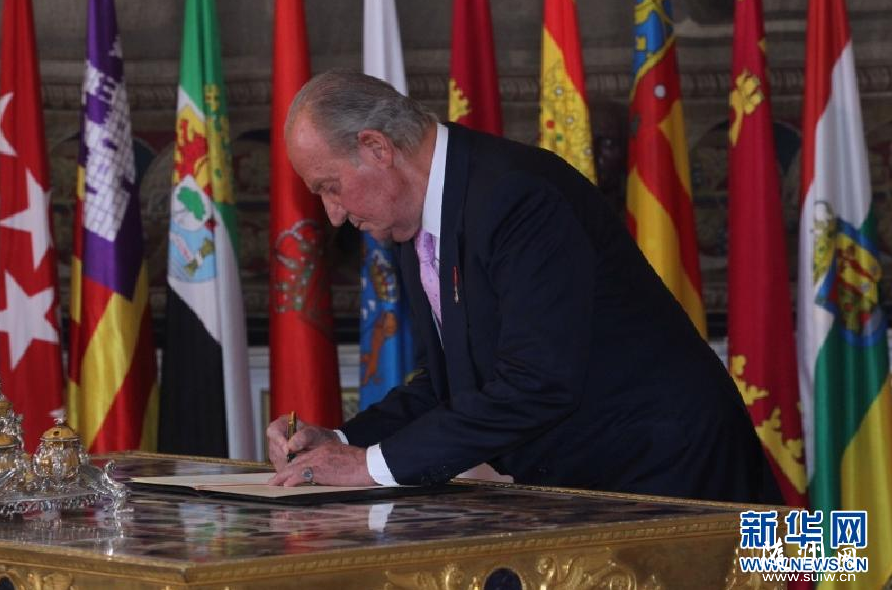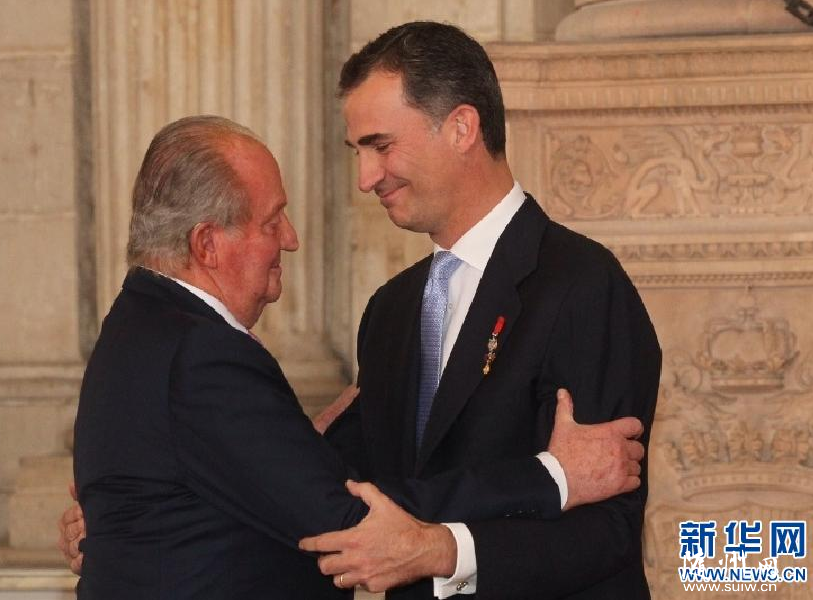 6月18日,在西班牙馬德里,西班牙國王胡安·卡洛斯一世(左)簽署退位法令后與王儲費利佩擁抱。西班牙國王胡安·卡洛斯一世18日在西班牙首都馬德里簽署法令,正式宣告退位。 新華社發(fā) 新華網(wǎng)馬德里6月18日電(記者謝海寧)西班牙國王胡安·卡洛斯一世18日在西班牙首都馬德里簽署法令,正式宣告退位。 國王退位法令簽署儀式在馬德里皇宮舉行。國王胡安·卡洛斯一世、王后索菲亞、王儲費利佩、王妃萊蒂西婭及其他150余名來賓出席了儀式。 胡安·卡洛斯一世在退位法令上簽字,隨后西班牙首相拉霍伊也在文件上簽字。這份法令將于19日零時正式生效,同一時刻王儲費利佩將正式繼承王位成為新一代西班牙國王費利佩六世。費利佩六世的登基典禮將于19日舉行。 |