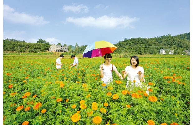 一朵朵五顏六色的鮮花爭(zhēng)奇斗艷,讓7月的曾都區(qū)洛陽(yáng)鎮(zhèn)銀杏谷成了花的海洋。該鎮(zhèn)農(nóng)民企業(yè)家嚴(yán)賢濤在當(dāng)?shù)亓鬓D(zhuǎn)土地130余畝,栽種萬(wàn)壽菊、薰衣草等20余種觀賞、藥用花卉,吸引了眾多游客。 (記者 李文軍攝)