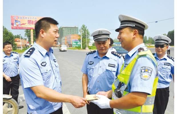 7月31日,隨縣副縣長(zhǎng)、公安局長(zhǎng)劉紅申(左二)來到交警大隊(duì)一中隊(duì)城區(qū)執(zhí)勤點(diǎn)看望高溫下堅(jiān)守的交通民警,感謝民警為隨縣的交管工作所作出的無私奉獻(xiàn)。此次慰問活動(dòng)還送來3000元慰問金和3箱礦泉水。 (戴玉平 王大群攝)