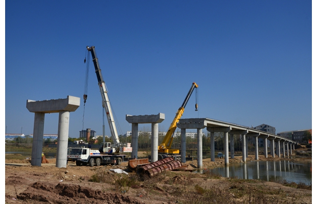 曾都區(qū)府河鎮(zhèn)孔家畈大橋主體工程正在緊張施工。該工程由國家財政和地方配套資金550萬元修建,建成后可以解決府河兩岸2萬人通行難題。 (記者 李文軍攝)
