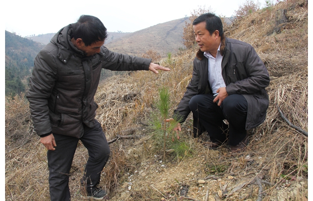 近日,市、縣兩級(jí)老促會(huì),到幫扶點(diǎn)隨縣環(huán)潭鎮(zhèn)調(diào)研項(xiàng)目發(fā)展情況。圖為劉廟村村民趙明國﹙左﹚,介紹今春栽的1300畝濕地松生長情況:目前已長到30多厘米高,成活率95%以上。 (通訊員 石守京 攝)