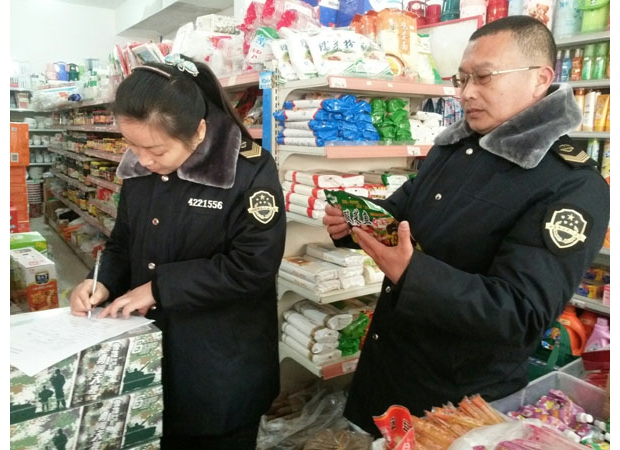 隨縣均川鎮(zhèn)食藥監(jiān)所嚴(yán)把年貨食品安全質(zhì)量關(guān),不間斷在轄區(qū)各大超市、副食品店檢查,發(fā)現(xiàn)問題食品,立即下架,追蹤溯源,予以處罰。圖為執(zhí)法人員在超市檢查情景。 (記者楊文明/攝 通訊員張勇/文)