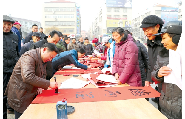 1月26日,中國楹聯(lián)學(xué)會(huì)書法藝術(shù)委員會(huì)委員、著名軍旅書法家等到廣水市印臺(tái)廣場和廣水書法家一道為當(dāng)?shù)厝罕姇鴮懘郝?lián),現(xiàn)場共書寫春聯(lián)300余副。(記者 張清 通訊員 程曉斌攝)