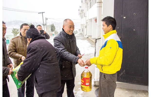1月28日,隨州日報社新一輪“三萬”活動工作隊冒著大雪來到駐點村曾都區(qū)何店鎮(zhèn)王店村,看望老黨員和困難戶,送去了食用油、大米等生活物資和慰問金。 (記者 徐斌攝)