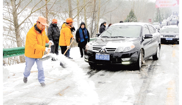 一夜大雪,十長公路廣水市長嶺東端百余車輛受阻滯留。一月二十九日上午,當(dāng)?shù)毓饭芾砣藛T以工業(yè)用鹽撒地溶雪,幫司機推車清障。十一時,道路通暢。(通訊員 吳克勤攝)