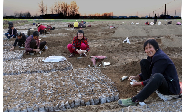 隨縣安居鎮(zhèn)朱河林場正組織農(nóng)民裝松樹育苗袋。(記者 孫洪濤攝)