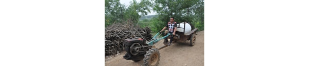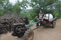 周家沖戶戶有水井,共36眼,自春上開始,35眼井滴水無(wú)存。村頭的一片野生葡萄園里,有兩眼新打的深井,水源充足。金成村和葡萄園老板商定,村里掏錢購(gòu)買水泵抽水,村民免費(fèi)使用,周家沖有了救命水源。水源有了,可村民們挑水卻不容易。這里有20余戶留守兒童和空巢老人,年長(zhǎng)的已80多歲。熱心腸的余庭洋就開始給這20余戶送水。一輛手扶拖拉機(jī),一個(gè)可裝約1噸水的塑料大水桶,是他送水的全部家當(dāng)。手扶拖拉機(jī)和用油都是他自己的,塑料桶也是他專程去棗陽(yáng)花300多元買回的。