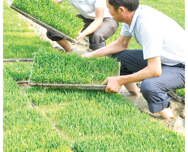 隨州網(wǎng)訊 隨縣安居鎮(zhèn)漂河村九組農(nóng)民王小虎(左)承包1500畝良田,實(shí)行機(jī)械化作業(yè)。圖為王小虎正在觀察自培自育的水稻秧盤,待時(shí)機(jī)插。 (記者 陳德友攝)