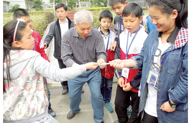 隨州網(wǎng)訊 近日,隨州市、區(qū)科協(xié)邀請(qǐng)的中科院六名專家教授,為曾都區(qū)七所中小學(xué)學(xué)生進(jìn)行科普教學(xué),圖為中科院教授陳賀能(左二),給用石頭等材料造的紙拔河的曾都區(qū)外國(guó)語(yǔ)學(xué)校學(xué)生當(dāng)裁判。(通訊員 劉毓多思攝)