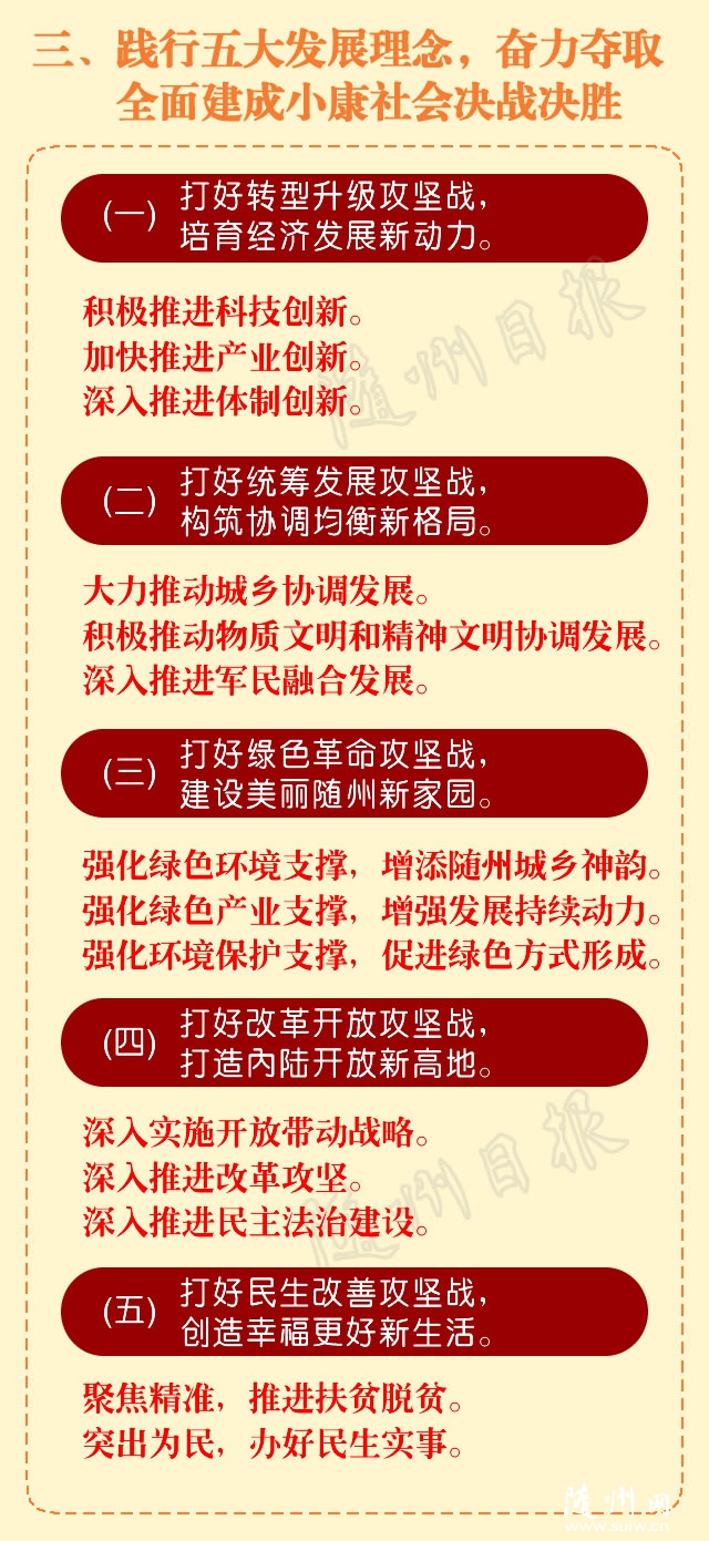 12月26日上午,備受全市黨員和人民群眾關(guān)注的中國(guó)共產(chǎn)黨隨州市第四次代表大會(huì)在神農(nóng)大劇院隆重開幕。這次大會(huì)總結(jié)了過(guò)去五年隨州市經(jīng)濟(jì)社會(huì)發(fā)展和黨的建設(shè)成績(jī),并部署未來(lái)五年發(fā)展的目標(biāo)任務(wù)。 劉曉鳴同志代表中國(guó)共產(chǎn)黨隨州市第三屆委員會(huì),向大會(huì)作了題為《堅(jiān)持實(shí)干興市,決勝全面小康,為建設(shè)區(qū)域性中心城市而努力奮斗》的工作報(bào)告。 郄英才主持會(huì)議。 那么,過(guò)去五年,隨州市都有哪些變化?今后五年,隨州市將有哪些大動(dòng)作? 小編帶您一圖讀懂隨州市第四次黨代會(huì)報(bào)告! 中國(guó)共產(chǎn)黨隨州市第四次代表大會(huì)主席團(tuán)成員名單 (2016年12月25日中國(guó)共產(chǎn)黨隨州市第四次代表大會(huì)預(yù)備會(huì)議通過(guò)) (共40人,按姓氏筆畫為序排列)王志勇 王洪江 甘國(guó)棟 田 濤 馮茂東 畢道麗(女) 劉文軍 劉自新劉曉鳴 劉愛(ài)書 江崇嵩 湯文江 李德榮 楊金貴 何運(yùn)平 余俊杰 閔文強(qiáng)張 健 張春霞(女) 陳 維 陳興旺 林常倫 羅 銘 羅國(guó)銀 郄英才周亞林 鄭 軍 趙品強(qiáng) 洪領(lǐng)先 夏衛(wèi)東 夏洪國(guó) 徐 德 郭永紅(女)黃 荊(女) 黃志群 黃繼軍 彭新作 董偉威 蔣星華 譚志勇 中國(guó)共產(chǎn)黨隨州市第四次代表大會(huì)秘書長(zhǎng)名單 (2016年12月25日中國(guó)共產(chǎn)黨隨州市第四次代表大會(huì)預(yù)備會(huì)議通過(guò))郭永紅(女) 中國(guó)共產(chǎn)黨隨州市第四次代表大會(huì)代表資格審查委員會(huì)成員名單 (2016年12月25日中國(guó)共產(chǎn)黨隨州市第四次代表大會(huì)預(yù)備會(huì)議通過(guò))主 任:郭永紅(女)副主任:甘國(guó)棟委 員:(按姓氏筆畫為序排列) 加玉計(jì) 朱建軍 劉秀玲(女) 劉愛(ài)書 李國(guó)壽 李經(jīng)發(fā) 張春霞(女) 張莉君(女) 徐正友 黃 荊(女) 熊宗耀 中國(guó)共產(chǎn)黨隨州市第四次代表大會(huì)主席團(tuán)常務(wù)委員會(huì)成員名單 (2016年12月25日中國(guó)共產(chǎn)黨隨州市第四次代表大會(huì)主席團(tuán)第一次會(huì)議通過(guò))劉曉鳴 郄英才 郭永紅(女) 鄭 軍 夏衛(wèi)東 彭新作 蔣星華 林常倫甘國(guó)棟 王志勇 馮茂東 中國(guó)共產(chǎn)黨隨州市第四次代表大會(huì)副秘書長(zhǎng)名單 (2016年12月25日中國(guó)共產(chǎn)黨隨州市第四次代表大會(huì)主席團(tuán)第一次會(huì)議通過(guò))鄭 軍 夏衛(wèi)東 甘國(guó)棟 王志勇 策劃:桂運(yùn)東 編審:許享紅 記者:李文軍、張 琴、徐 斌、陳巧玲 編輯:伍雅兮 制圖:李發(fā)兵 |