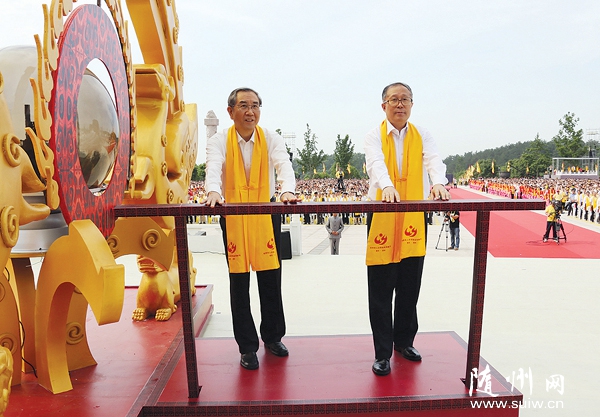 海內(nèi)外近萬炎黃子孫齊聚烈山拜謁始祖 乙未年世界華人炎帝故里尋根節(jié)隆重舉行 馬飚許嘉璐張榮恭李鴻忠楊松等出席 圖一:莊嚴(yán)、肅穆的大典現(xiàn)場。 (隨州網(wǎng)記者 孫洪濤攝) 圖二:全國政協(xié)副主席馬飚(左),湖北省委書記、省人大常委會主任李鴻忠(右)恭啟圣門。 (隨州網(wǎng)記者 孫洪濤 攝) 圖三:第十屆全國人大常委會副委員長、中華炎黃文化研究會會長許嘉璐宣布大典開幕。 (隨州網(wǎng)記者 孫洪濤 攝) 隨州網(wǎng)訊 記者陳曉林報道:同根同祖,血濃于水;同心同愿,祈福中華。2015年6月12日,農(nóng)歷四月二十六,乙未年世界華人炎帝故里尋根節(jié)開幕式暨拜祖大典在湖北隨州隆重舉行。海內(nèi)外近萬名炎黃子孫再聚烈山,拜謁中華民族的人文始祖炎帝神農(nóng)氏,緬懷圣祖功德,祈愿國泰民安、人民幸福。 全國政協(xié)副主席馬飚,第十屆全國人大常委會副委員長、中華炎黃文化研究會會長許嘉璐出席大典。 中國國民黨中央評議委員會主席團主席張榮恭,中共湖北省委書記、省人大常委會主任李鴻忠,湖北省政協(xié)主席楊松,海峽兩岸關(guān)系協(xié)會副會長孫亞夫,中國文學(xué)藝術(shù)界聯(lián)合會副主席、書記處書記楊承志,中華全國歸國華僑聯(lián)合會副主席康曉萍,中華炎黃文化研究會常務(wù)副會長兼秘書長張希清,衛(wèi)生部原副部長、世界中醫(yī)藥學(xué)會聯(lián)合會會長佘靖,省領(lǐng)導(dǎo)傅德輝、梁偉年、李春明、甘榮坤、劉善橋,省老領(lǐng)導(dǎo)李明波、林志慧,陜西省政府原副省長吳登昌,海峽兩岸旅游交流協(xié)會秘書長劉克智,中國科學(xué)院院士陳可冀,中國工程院院士李連達(dá),泰國國防宗教文化部副主席周力平,全美華裔總商會主席梁冠軍,香港特區(qū)政府駐漢代表方明遠(yuǎn),澳門特區(qū)政府駐京代表束文剛,臺灣苗栗縣前縣長劉政鴻,中國國民黨中央委員會常務(wù)委員曾文培,中國國民黨中央委員會委員翁文斌、詹昭榮,臺灣中華神農(nóng)大帝協(xié)進(jìn)會副理事長方雕義,抗戰(zhàn)老兵靳明、孫維禮,中共隨州市委書記劉曉鳴、市長郄英才等參加大典。 昨日的隨州,陽光燦爛、惠風(fēng)和暢、生機盎然。烈山之上,炎帝圣像莊嚴(yán)偉岸,令人起敬。嘉賓們懷著崇敬的心情,陸續(xù)步入拜祖廣場,共同期待著激動人心的一刻。 上午8時38分,在《詩經(jīng)·小雅·鹿鳴》的兒童吟誦聲中,大典開始。經(jīng)過奉祀方陣入場、祭祀舞蹈《八佾舞》等環(huán)節(jié),大典進(jìn)入拜祖儀式。副省長甘榮坤主持儀式。拜祖儀式共有九項儀程: ——大典致辭。甘榮坤致歡迎辭。他說,華夏悠悠文明史,烈山腳下是源頭。5000多年前,炎帝神農(nóng)在此以堅韌不拔的開拓精神、百折不撓的創(chuàng)新精神、自強不息的進(jìn)取精神、天下為公的奉獻(xiàn)精神,為天地立心,為生民請命,為民族開太平,發(fā)祥文明,肇始華夏。無論時代如何變遷,炎帝精神始終是中華民族自強不息的力量源泉,始終是炎黃子孫團結(jié)奮斗的精神旗幟,激勵著中華民族從遠(yuǎn)古走向文明,從蒙昧走向輝煌。 ——大典開幕。第十屆全國人大常委會副委員長、中華炎黃文化研究會會長許嘉璐宣布大典開幕。 ——恭啟圣門。全國政協(xié)副主席馬飚和中共湖北省委書記、省人大常委會主任李鴻忠共同開啟炎帝神農(nóng)大殿圣門。 ——點燃圣火。在《三獻(xiàn)禮》的唱誦樂舞聲中,中國科學(xué)院院士陳可冀、香港特區(qū)政府駐漢代表方明遠(yuǎn)、澳門特區(qū)政府駐京代表束文剛、臺灣中華神農(nóng)大帝協(xié)進(jìn)會副理事長方雕義和來自全國的30名鄉(xiāng)村教師共同點燃炎帝圣火。 ——敬獻(xiàn)花籃。各級領(lǐng)導(dǎo)和嘉賓馬飚、許嘉璐、張榮恭、劉政鴻、曾文培、孫亞夫、楊承志、康曉萍、張希清、李鴻忠、楊松、李春明、甘榮坤、劉曉鳴、郄英才等分批敬獻(xiàn)花籃。 ——敬獻(xiàn)高香。華人華僑、港澳臺人士、文化界、企業(yè)界、宗教界等各界代表劉克智、周力平、梁冠軍、姚征、胡曉軍、馬克、翁文斌、詹昭榮、陳興國、陳雄英、劉紅軍、佘靖、李連達(dá)、吳登昌、任學(xué)安、米東明、李抗美、劉富民、孫光榮、余世存、常文光、張杰、鄧建玲、何亞非、焦正軍、邱曙平、嚴(yán)介和、汪力成、曾穎堂、莫躍明、陳宏志、田長桉、劉俊剛、尼瑪扎西、沈田義、劉廣東、劉寶林、徐德、釋印順、吳誠真等依次敬獻(xiàn)高香。 ——恭讀頌祖文。炎帝子孫代表、故里學(xué)生代表恭讀《頌炎帝文》。 ——共拜始祖。現(xiàn)場全體人員向炎帝神農(nóng)行施拜禮。 ——唱誦始祖。合唱《炎帝大歌》,匯聚世界各地華人心聲的《赤子之聲》,由海峽兩岸學(xué)子共同表演的編鐘樂舞《神農(nóng)贊》,以及壓軸歌曲《炎帝情,中華夢》,唱誦了始祖的豐功偉績,表達(dá)了華夏兒女對炎帝的深深敬仰。 炎帝故里尋根節(jié)是湖北省知名文化品牌。“隨州神農(nóng)祭典”項目九項儀程入選國務(wù)院第三批國家級非物質(zhì)文化遺產(chǎn),隨州作為我國炎帝祭祀中心的地位得以確認(rèn)。 嘉賓們稱贊,今年的拜謁大典,既嚴(yán)格遵循了規(guī)制,又與時俱進(jìn)地增添了社會主義核心價值觀、“一帶一路”戰(zhàn)略、抗戰(zhàn)勝利70周年等新元