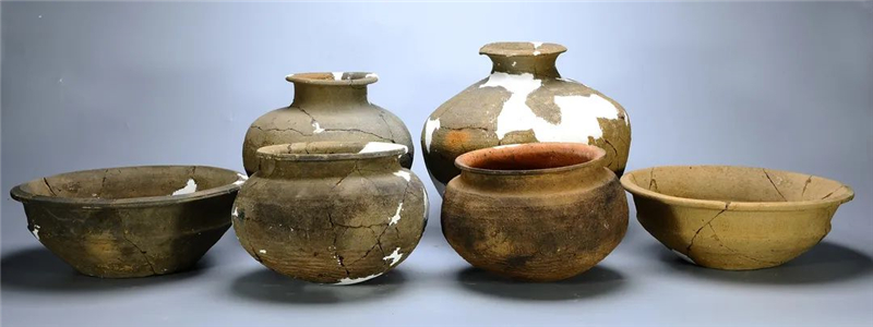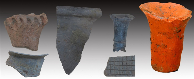 夏家灣遺址考古發(fā)掘的石家河文化早期遺存分布不連續(xù),文化堆積較薄,發(fā)現(xiàn)有灰坑、墻基槽等遺跡,出土有紅陶杯、刻槽盆、擂缽、寬扁形鼎足、磨光黑陶杯柄、藍(lán)紋罐、缸等日常生活陶器和石斧、鑿、錛、鏃、陶紡輪等生產(chǎn)用具。發(fā)掘出的西周時(shí)期遺存多見(jiàn)灰溝、灰坑和燒面遺跡,出土了大量鬲、豆、罐、甗、盆等陶器殘片和鹿角、豬頜骨、牛牙等動(dòng)物牙齒或骨骼,以及箭鏃等銅器,還發(fā)現(xiàn)坩堝殘片、銅矛和銅飾件等冶煉遺物。這些冶煉遺物、燒面遺存和銅器,共同揭示了該遺址冶煉鑄銅的功能性質(zhì)。發(fā)掘戰(zhàn)國(guó)至秦朝時(shí)期豎穴土坑墓數(shù)座,隨葬品中可見(jiàn)銅箭、陶器以及動(dòng)物骨骼殘存,陶器多為鏊、釜、罐、盆、甑等組合。