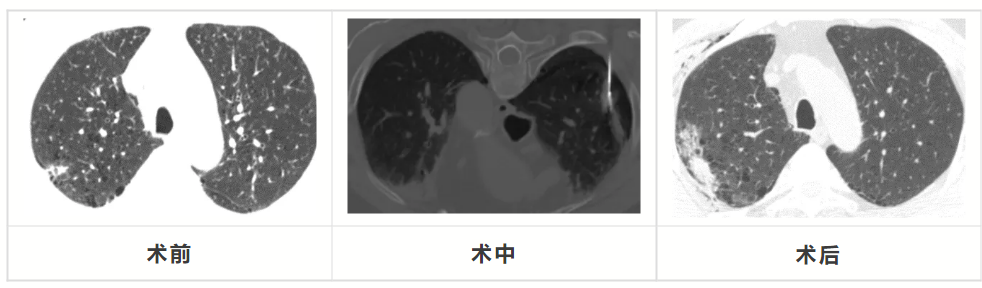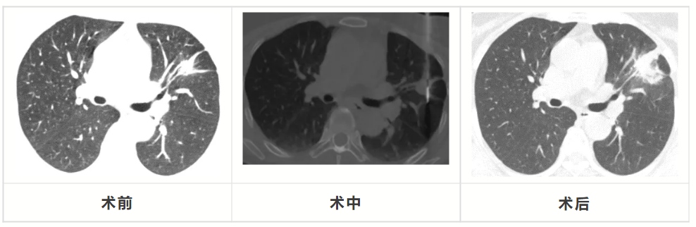 呼吸與危重癥醫(yī)學科三病區(qū)副主任醫(yī)師謝燦果、主管醫(yī)師李金林與患者及家屬溝通后,患者選擇經皮微創(chuàng)手術——肺部腫瘤微波消融術。隨即完善術前準備,局麻后在CT引導下將微波穿刺針穿透腫瘤,經過低功率2個循環(huán)的微波消融治療,消融灶完全覆蓋腫瘤,以期達到近似外科手術的根治性治療效果。