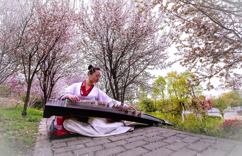 2月21日,隨州濱湖公園內(nèi)紅梅綻放,一位女子身著漢服席地而坐、輕撫古箏,以悠揚(yáng)琴音奏響春之樂章。