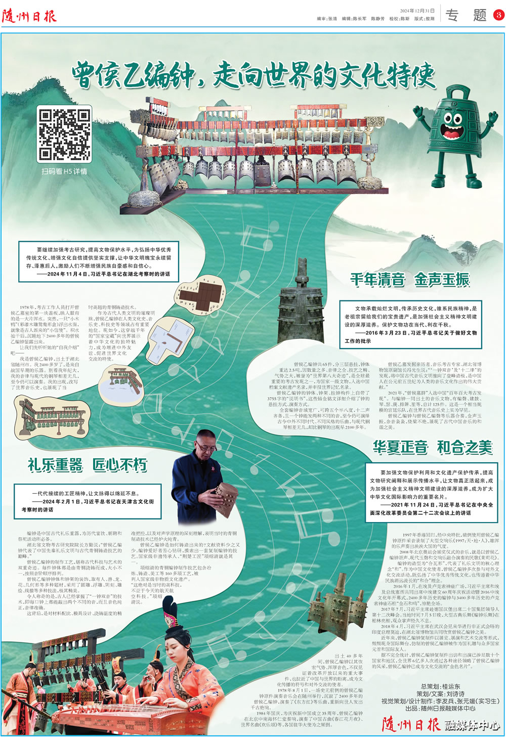 作為古代人類文明的璀璨明珠,曾侯乙編鐘在人類文化史、音樂史、科技史等領(lǐng)域占有重要地位,F(xiàn)如今,這穿越千年的“國家寶藏”向世界展示著中華文化的獨特魅力,成為增進中外友誼、促進世界文化交流的特使。