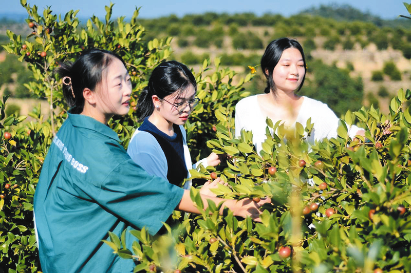 澴潭鎮(zhèn)年輕干部正在岳雄豐“智慧茶園基地”采摘油茶果