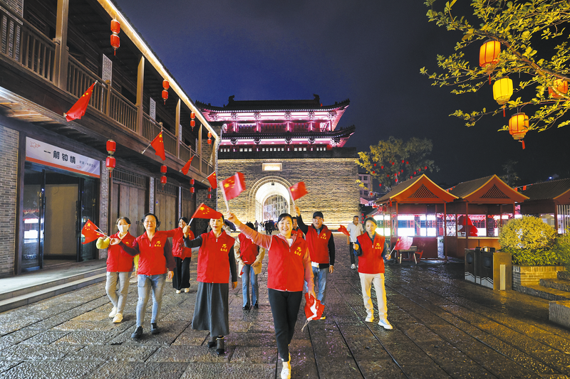 一批志愿者在草甸子街揮舞著國旗慶祝國慶節(jié)