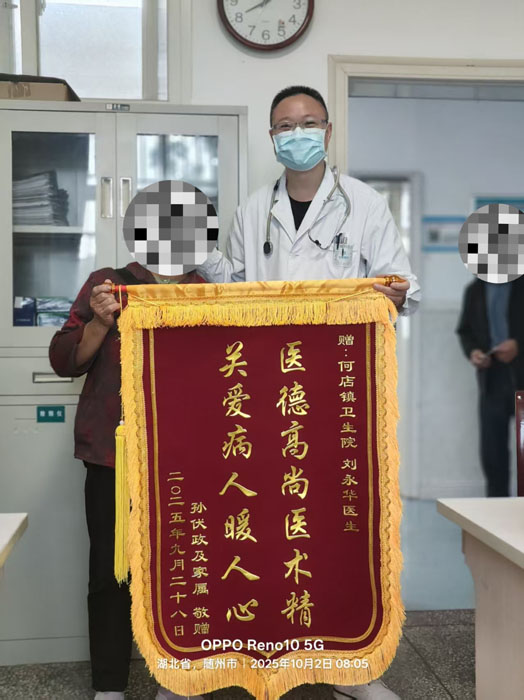 隨州新聞網(wǎng)訊 (通訊員王靜)金秋十月,國慶的紅意正濃。10月2日清晨,當(dāng)節(jié)日的喜慶氛圍還在何店鎮(zhèn)街頭流淌,何店鎮(zhèn)中心衛(wèi)生院內(nèi)科病房里卻上演了比紅飄帶更溫暖的一幕——患者孫大娘手捧一面紅底金字的錦旗,早早等候在內(nèi)科醫(yī)生劉永華面前,將那份沉甸甸的感激,穩(wěn)穩(wěn)地送入他手中。