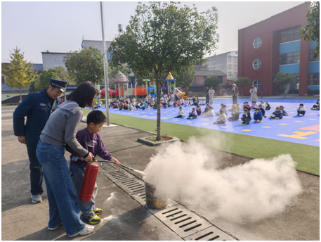 隨后,保安人員現(xiàn)場講解并演示了滅火器的正確使用方法,通過“提、拔、握、壓”四個步驟,展示了撲滅初起火災的過程。孩子們看得目不轉(zhuǎn)睛,在實踐中加深了對消防器材的認識。