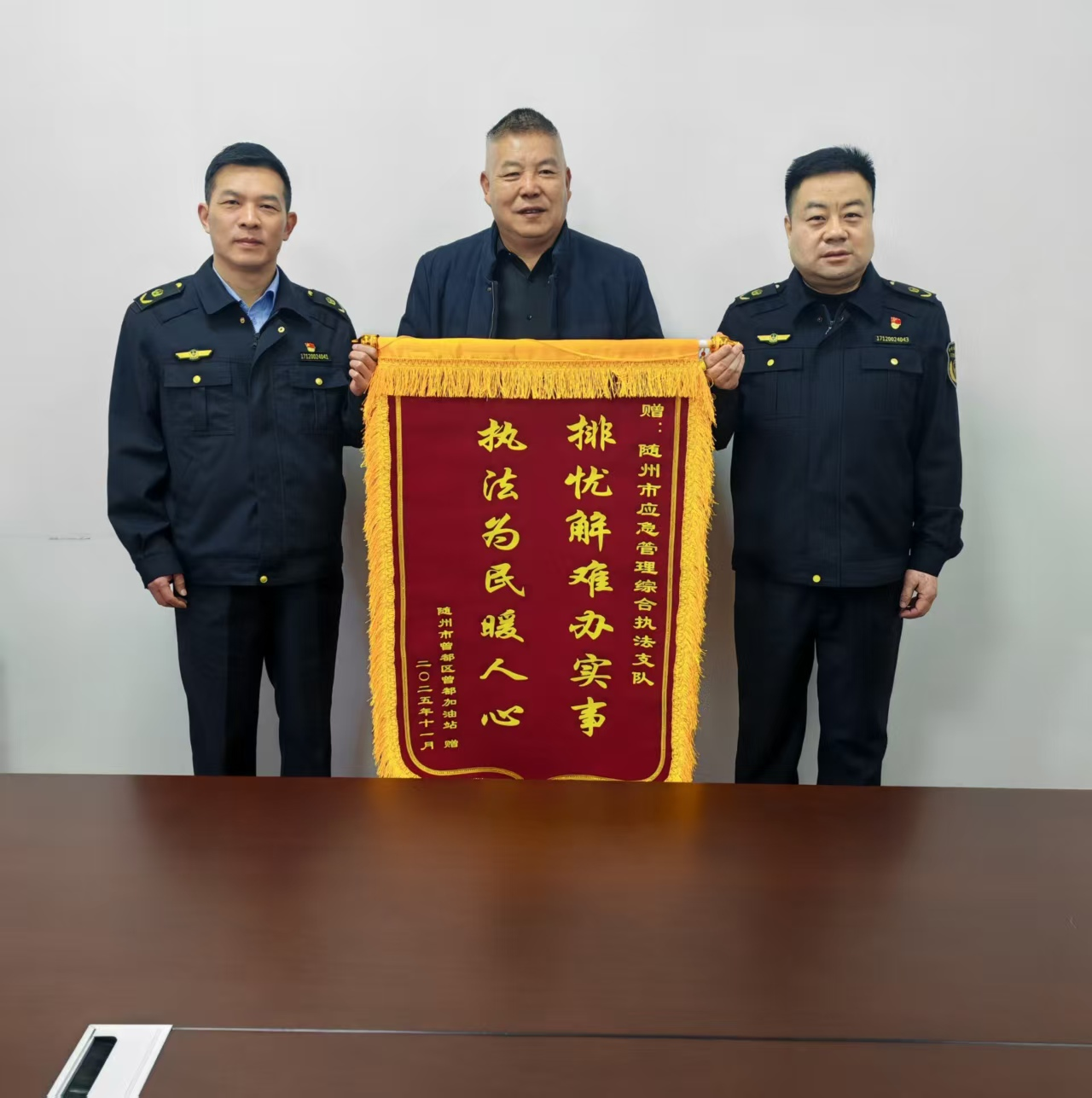 11月28日,曾都區(qū)曾都加油站負責人劉某專程來到隨州市應急管理綜合執(zhí)法支隊,將一面印有“排憂解難辦實事,執(zhí)法為民暖人心”字樣的錦旗送到執(zhí)法人員手中,以此表達對支隊在其經(jīng)營發(fā)展中提供精準指導、排憂解難的誠摯謝意。這一面錦旗,不僅是企業(yè)對支隊工作的肯定,更是支隊堅持嚴格規(guī)范執(zhí)法與精準優(yōu)質服務相結合,持續(xù)優(yōu)化營商環(huán)境的生動縮影。