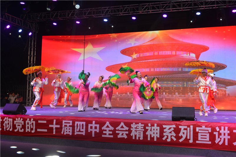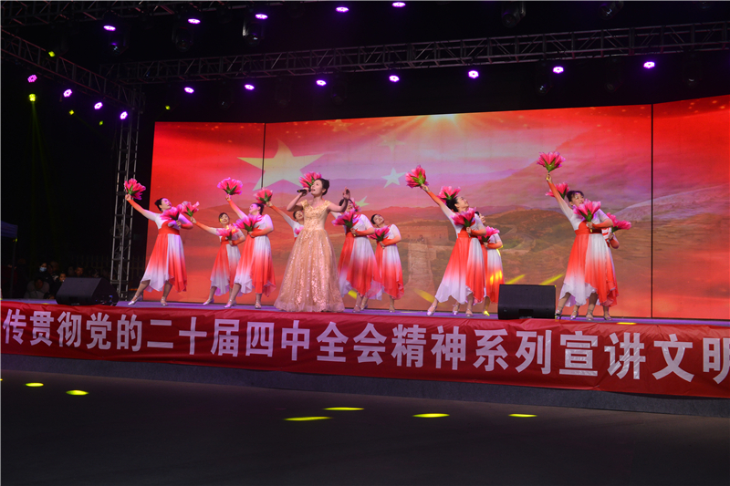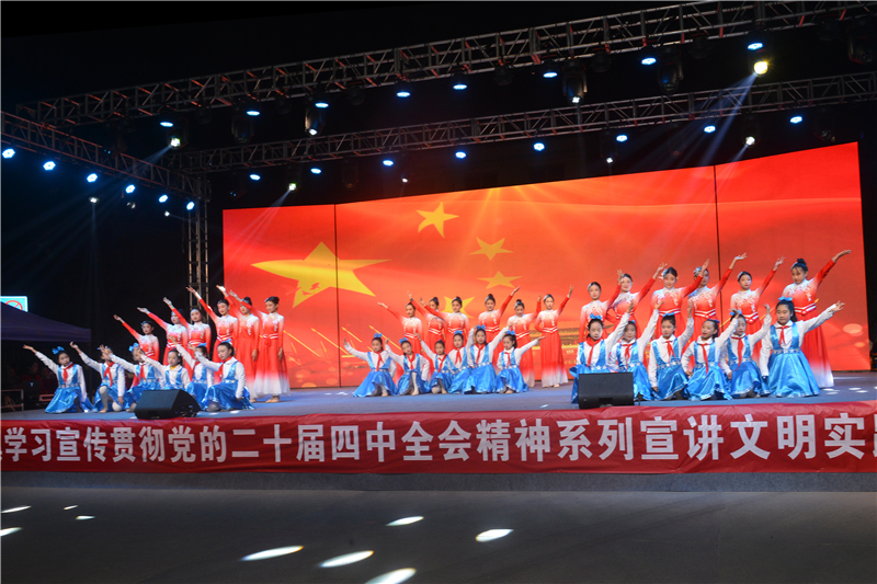 晚會(huì)在淅河鎮(zhèn)第一小學(xué)表演的《鼓舞中國》中拉開活動(dòng)序幕,淅河鎮(zhèn)綜合文化服務(wù)中心舞蹈隊(duì),舞蹈《太陽出來喜洋》,烈山社區(qū)藝術(shù)團(tuán),快板《隨州處處好風(fēng)光》,淅河鎮(zhèn)云龍社區(qū)舞蹈隊(duì),歌伴舞《幸福中國一起走》,淅河鎮(zhèn)第一小學(xué),舞蹈《成長(zhǎng)在祖國的懷抱里》,淅河鎮(zhèn)劉蓮?fù)L(fēng)鑼鼓藝術(shù)團(tuán),非遺表演《打蓮響》,淅河鎮(zhèn)綜合文化站銀杏藝術(shù)團(tuán),情景劇《清潔家園美如畫》,淅河鎮(zhèn)大廟村書記馮享國獨(dú)唱《畫你》,淅河鎮(zhèn)二棉社區(qū)舞蹈一隊(duì),舞蹈《祝福你盛世中華》,淅河鎮(zhèn)土城村金秋舞動(dòng)隊(duì),秧歌舞《紅歌大連唱》,曾都區(qū)中醫(yī)醫(yī)院,朗誦《白衣執(zhí)手,暖照新元》,淅河鎮(zhèn)綜合文化站舞韻藝術(shù)團(tuán),舞蹈《江山》將活動(dòng)推向高潮。老街社區(qū)居民王明軒說,現(xiàn)在黨的政策好,我們淅河鎮(zhèn)經(jīng)常開展大型文藝活動(dòng),送戲下鄉(xiāng),送電影下鄉(xiāng)保障了人民群眾的文化生活,讓我們能夠欣賞高雅藝術(shù),我們住在這里開心,這也是淅河鎮(zhèn)開展新時(shí)代文明實(shí)踐活動(dòng)的成果展示,豐富了我們居民們的文化生活。