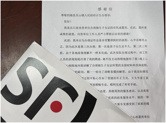 隨州新聞網(wǎng)訊 (通訊員肖健)近日,吳山政府計生辦收到辦事群眾成女士寄來的感謝信,字里行間滿是對計生辦工作人員的誠摯謝意,傳遞著政務服務的溫度與暖意。這封感謝信,既是群眾對其個人業(yè)務能力的肯定,更是對吳山政府全體干職工踐行“為民辦實事”宗旨的生動印證。