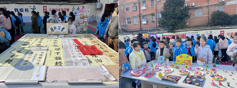 籃球場周邊的成果匯報區(qū),同樣洋溢著全員參與的濃厚氛圍。簡筆畫、水彩畫、剪紙、粘土、十字繡等作品琳瑯滿目,展板上的每一筆色彩、每一件手作,都出自社團(tuán)成員之手。從低年級的稚嫩創(chuàng)作到高年級的精致作品,人人有作品,班班有亮點,每一份成果都是日積月累的成長印記,盡顯學(xué)生的創(chuàng)造力與專注力。