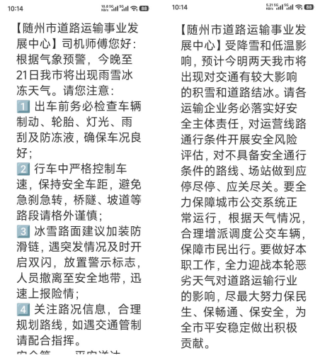 及時預警,壓實責任。我中心及時將最新氣象信息通過微信工作群、短信平臺發(fā)送到“兩客一!、農村客運、出租車及公交企業(yè)負責人、車輛駕駛員,將本輪冰雪天氣的安全責任層層壓實至每一位駕駛員,叮囑司乘人員運用好《道路運輸駕駛員應急駕駛操作指南》,出車前確保車況良好,行車中控制車速,密切關注路況信息,杜絕冒險行車,確保行車安全。
