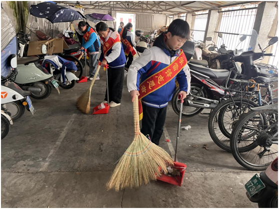 校園里涌動(dòng)起一支支“雷鋒小隊(duì)”。孩子們?nèi)宄扇,拿著抹布、掃帚,走進(jìn)花壇、車棚、走廊,不放過一處衛(wèi)生死角。二年級(jí)的小朋友踮起腳尖,用力擦拭墻面的污漬;五年級(jí)的“大哥哥大姐姐”帶頭鉆進(jìn)花壇、車棚深處,撿起藏匿的紙屑。校園,在這一刻變得格外明亮。