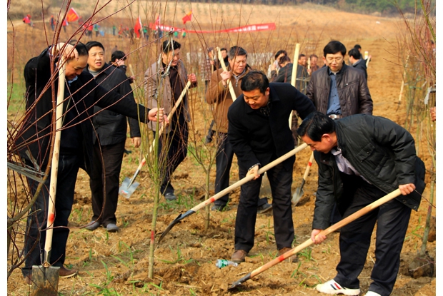 在該鎮(zhèn)興河村侯家灣的植樹現(xiàn)場,一番熱火朝天的景象。大家三個一群、五個一伙,有的揮鍬鏟土,有的扶苗填坑,有的踏土夯苗,有的提水灌溉……每個人都在劃分好的“自留地”里精耕細(xì)作,勁頭十足。經(jīng)過半天的緊張勞動,大家共栽植油桃樹苗6000余株,綠化面積達(dá)150畝。放眼望去,連片的小樹苗錯落有致,昂然挺立,萌發(fā)勃勃生機(jī)。